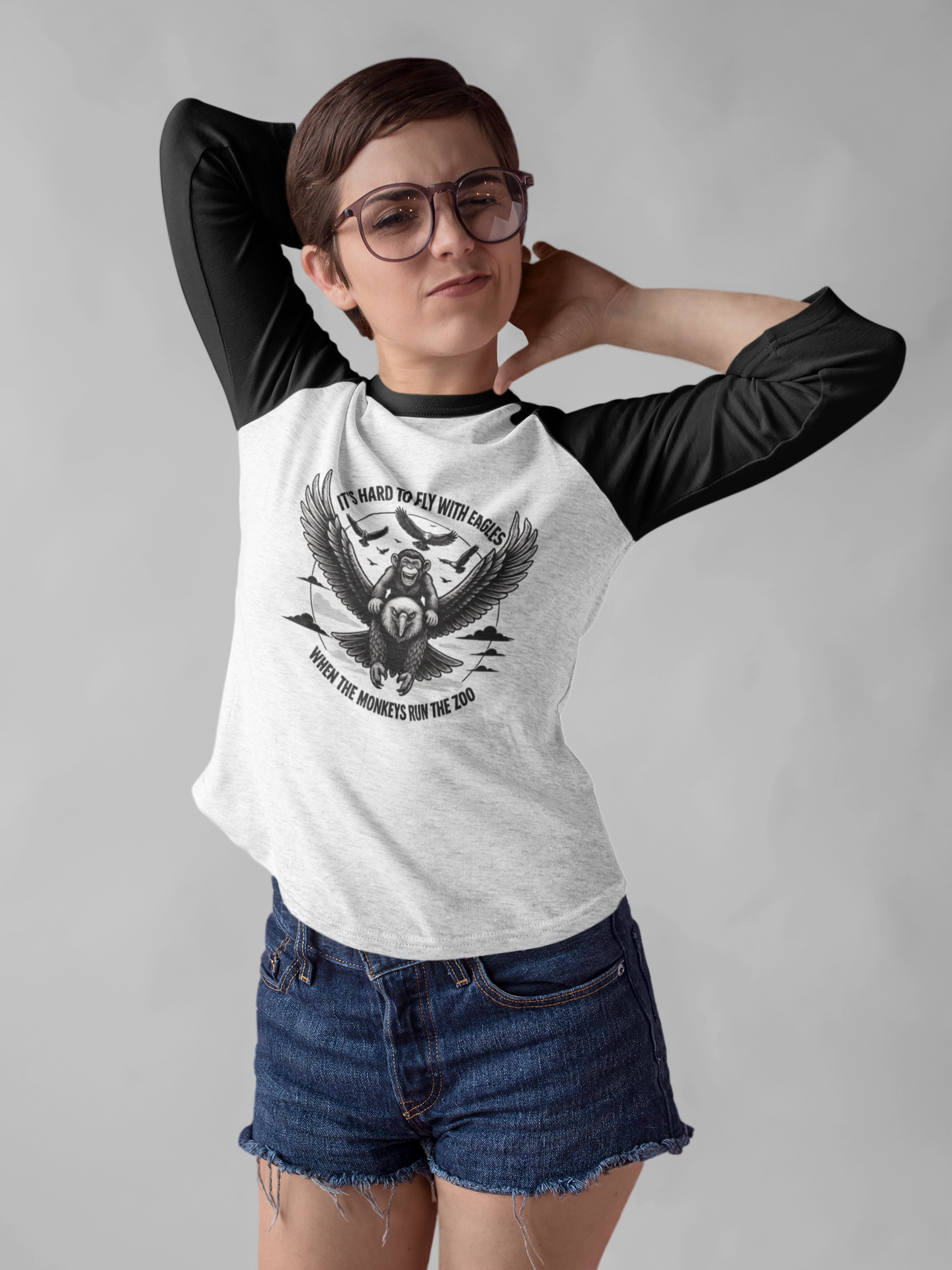 The It’s Hard to Fly with Eagles – 3/4 Sleeve T-Shirt is a wearable middle finger to mediocrity. Featuring bold eagle-and-monkey artwork and the infamous Aussie truth bomb: