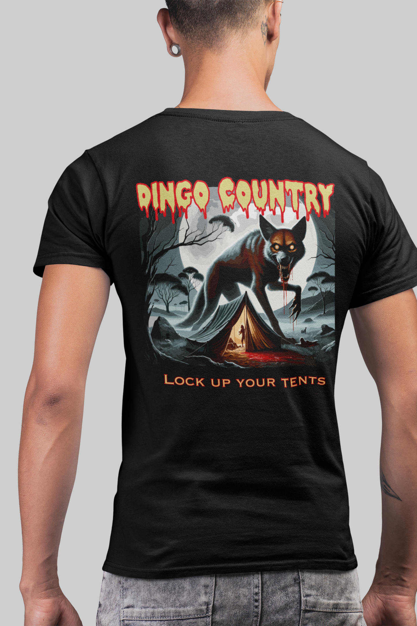 The Lock Up Your Tents – Men’s T-Shirt throws a twisted spotlight on one of Australia’s most notorious and controversial true crime stories: the “a dingo stole my baby” saga. With a retro horror-style graphic that looks ripped straight from a VHS tape, this shirt brings comedy and chills in equal measure. Part of the exclusive Dingo Country Horror Comedy Line, it’s designed for those who like their tees like their humour — pitch-black and unapologetically Aussie.