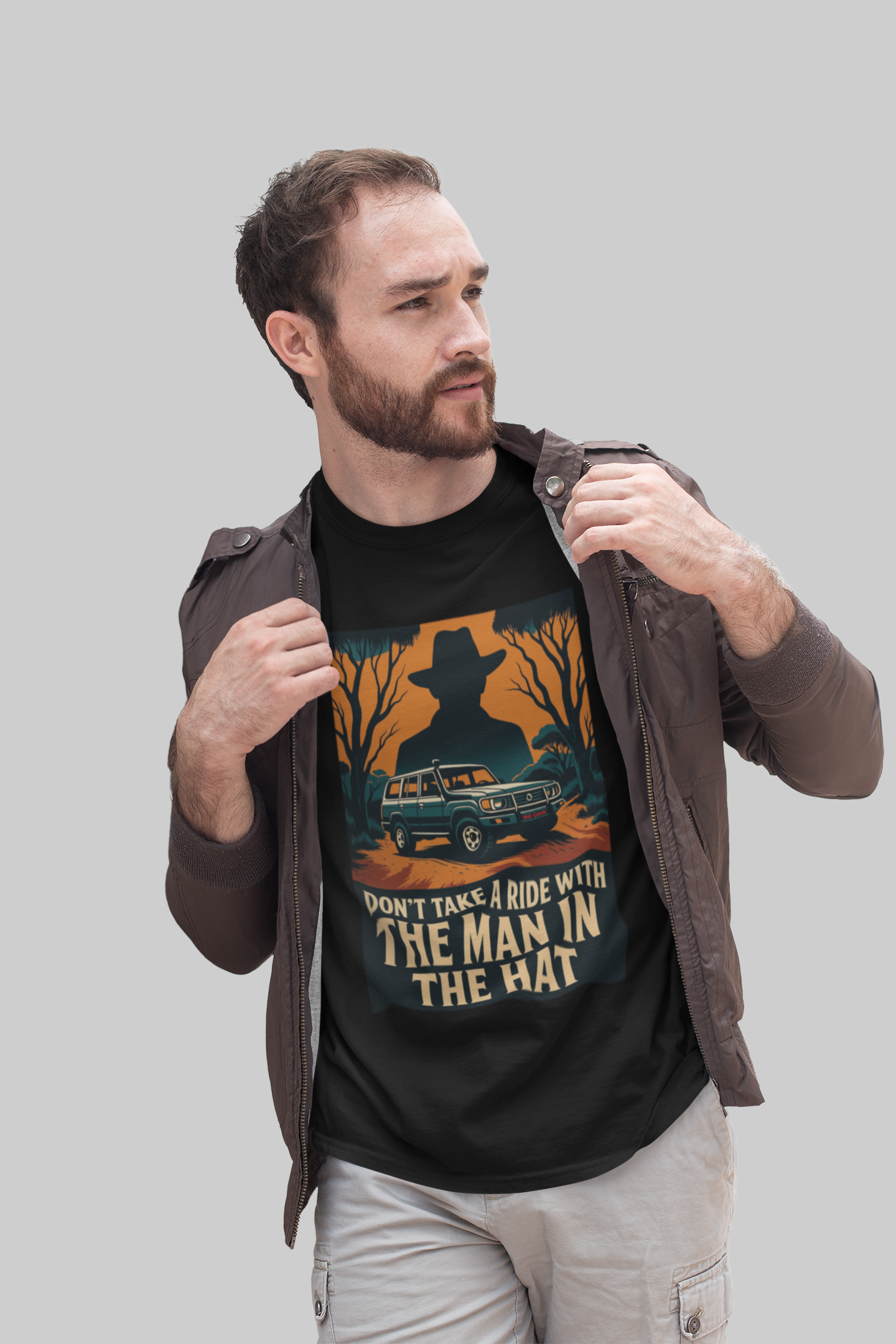 This Man in the Hat – Men’s T-Shirt taps into one of Australia’s most chilling true-crime legends and twists it into pure horror-comedy gold. Featuring an eerie outback scene and bold retro-style graphic, this tee feels like the poster for a film you’re too scared to watch — but can’t look away from.