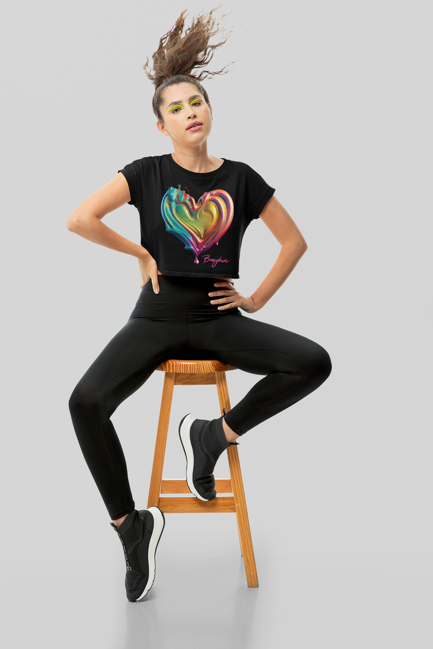 Celebrate love with a splash of colour in the Boughan Collection's Women's Vivid Heart Crop Top. This stunning piece features a glossy, flowing heart design, artistically rendered in a spectrum of vibrant hues that capture the essence of modern art. Tailored to flatter and fashioned to express, this crop top is the epitome of contemporary chic. Perfect for a day out or an evening of fun, it's a wardrobe essential for those who love to make a bold fashion statement. Wear art, wear passion, wear Boughan.